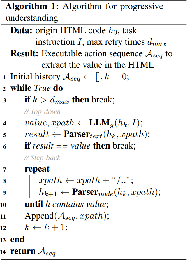 4: 현재 HTML code h와 작업 지시 I를 바탕으로 LLM이 예상 value와 XPath를 생성한다. 5, 6: XPath에서 텍스트를 추출하고 원하는 정보와 일치하는 지 확인한다. 7 ~ 10: '/..'은 DOM tree의 상위 노드를 의미한다. 상위 노드를 거슬러 올라가며 value가 존재하는 지 확인하고 그렇지 않으면 HTML을 정리한다. (DOM tree 가지치기) 알고리즘에는 LLM이 한 번만 표기되어 있지만 위 그림에도 나와 있듯이 XPath를 실제로 수행하거나 코딩 작업을 제외하면 대부분 작업에 LLM이 사용된다. |