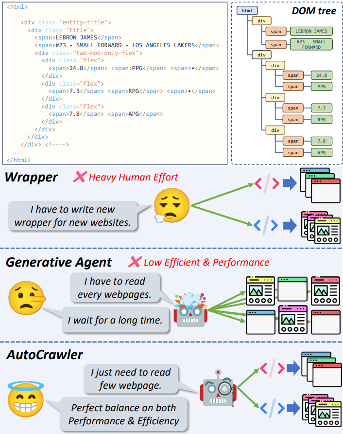 HTML의 계층적 구조와 LLM을 활용하여 확장성이 뛰어난 crawler인 AutoCrawler 제안