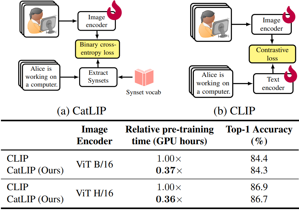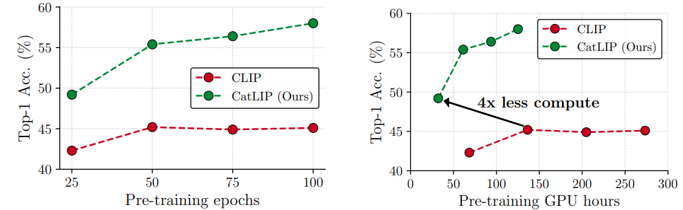 Image-text pretraining을 분류 작업으로 재구성하여 성능을 유지하면서도 빠르게 훈련할 수 있는 CatLIP 제안