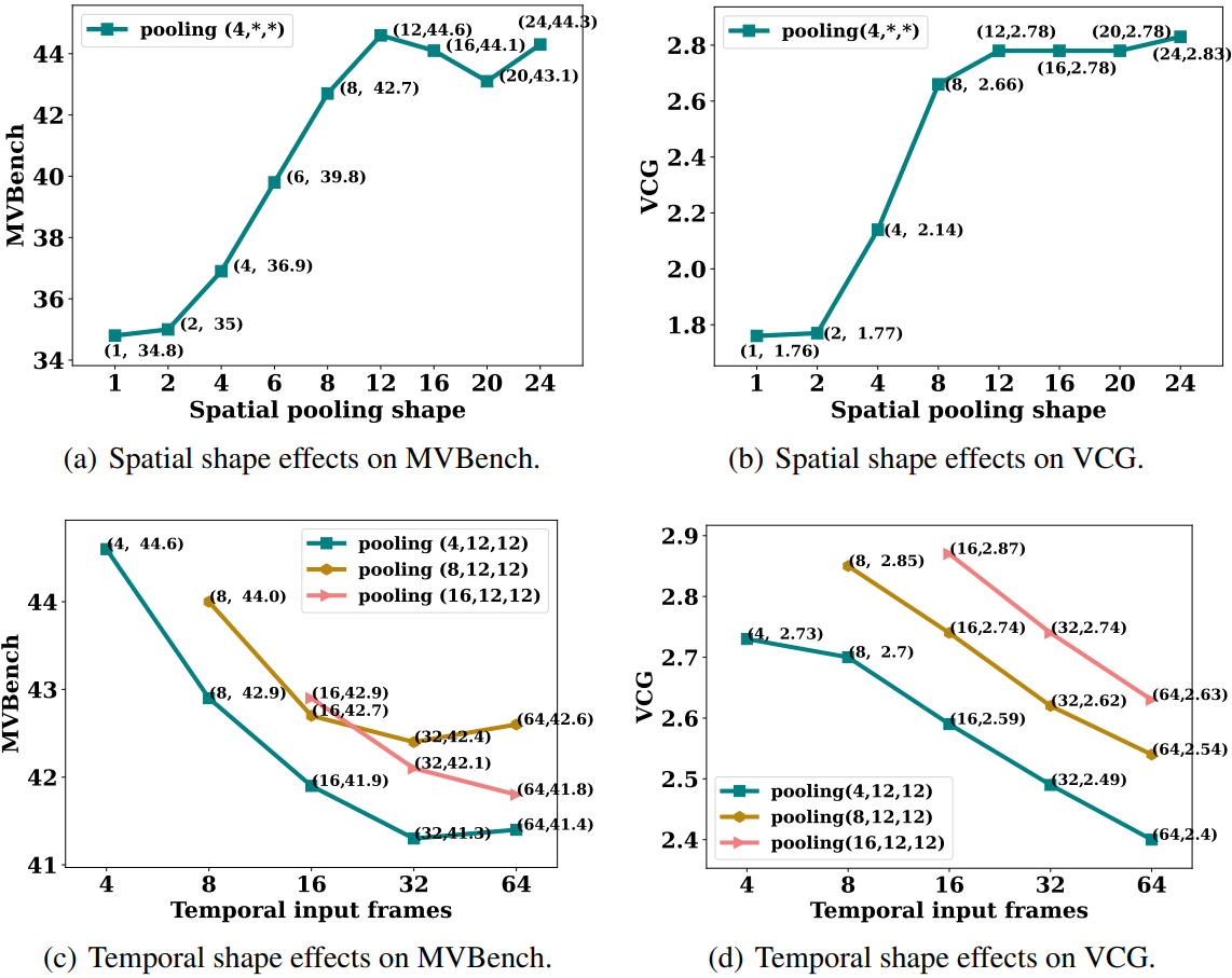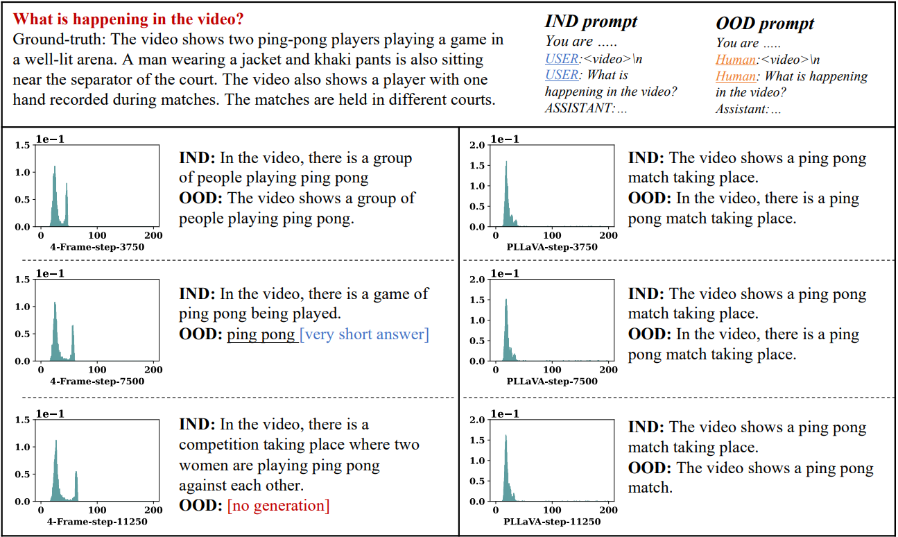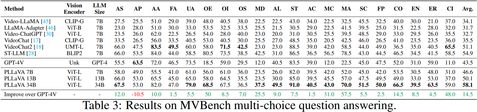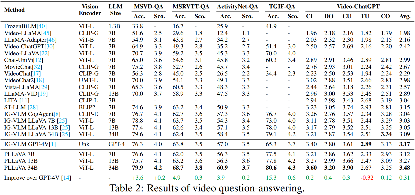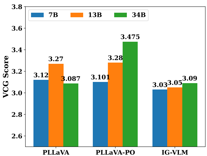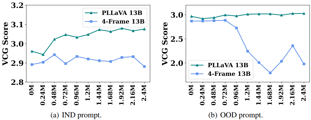 위에서 언급했듯이 PLLaVA 또한 모델 크기와 성능이 비례하지 않는다. 연구진은 성능 저하의 이유가 낮은 품질의 비디오-텍스트 데이터 학습으로 인한 언어 능력 저하 때문이라고 가정했다.