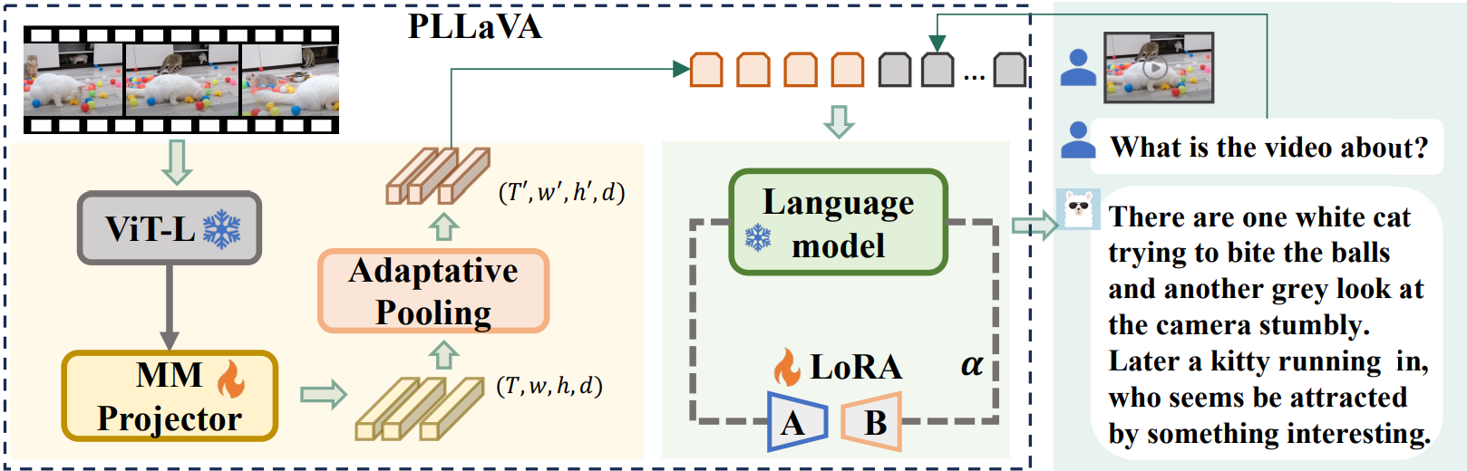 PLLaVA는 여기서 풀링을 통해 feature를 한번 더 압축하고 LoRA로 LLM을 fine-tuning 한다.