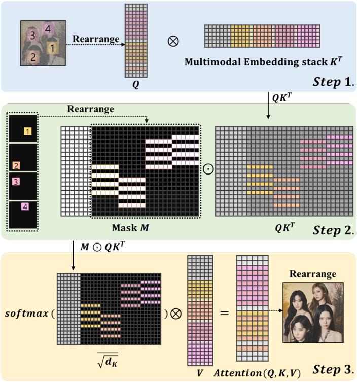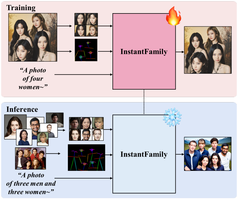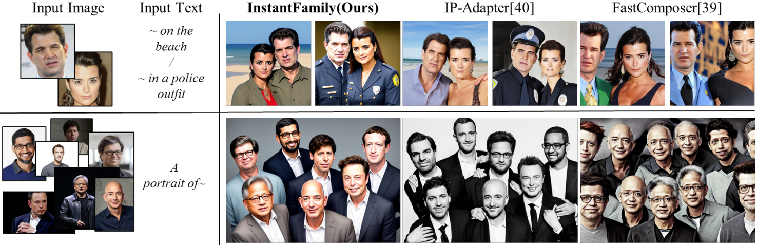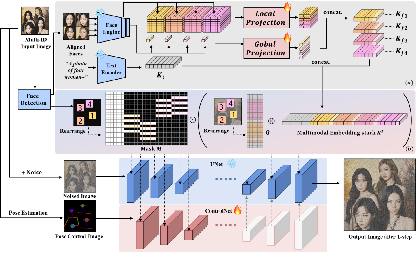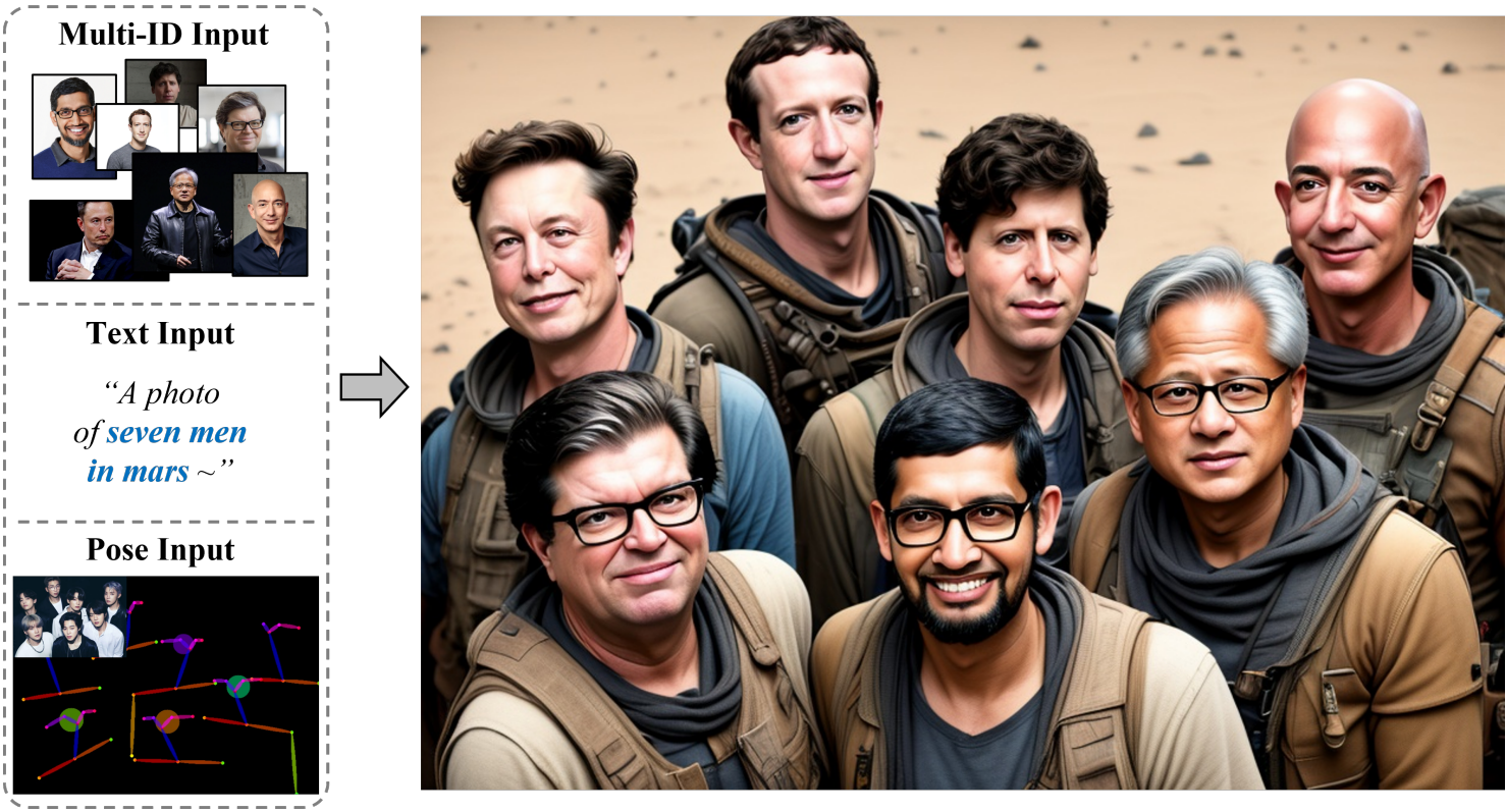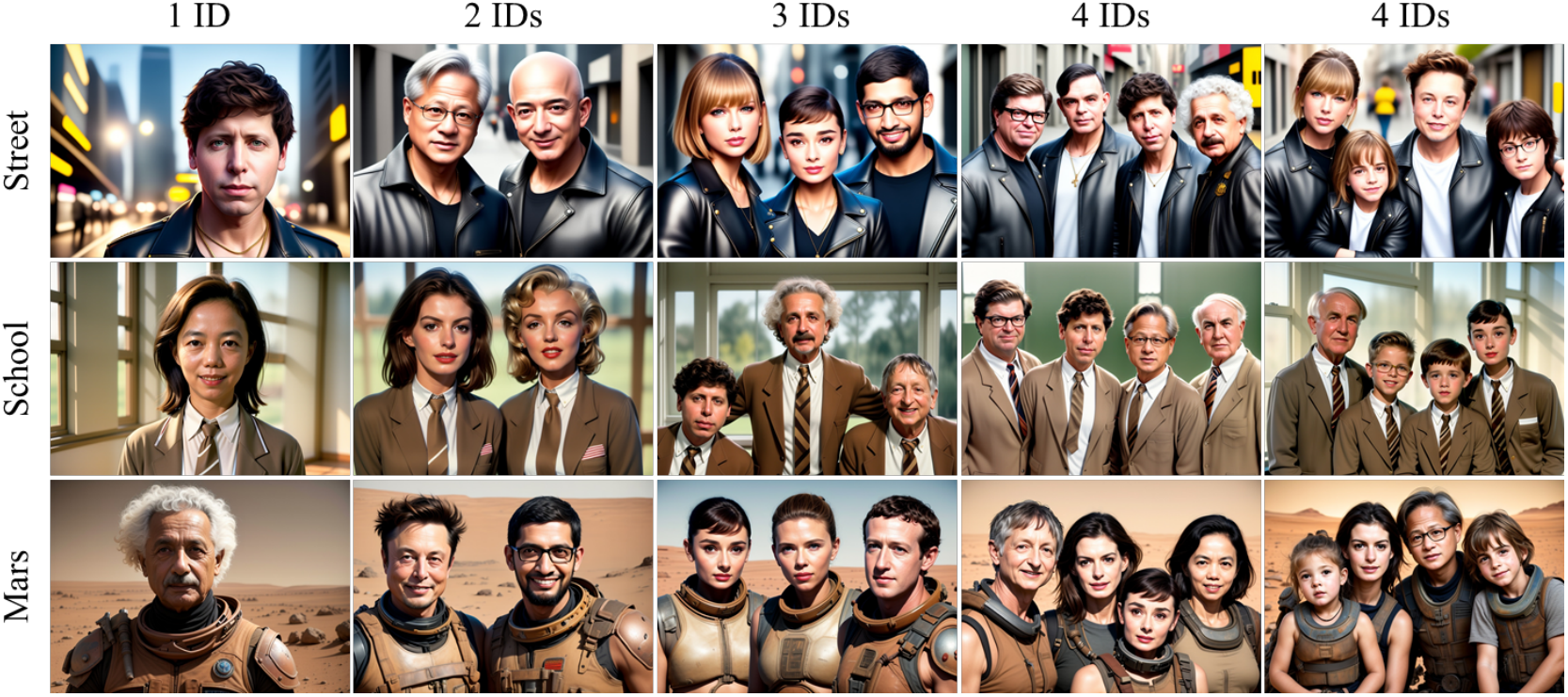 Multi-modal embedding stack, masked cross-attention을 통해 multi-ID 생성 문제를 해결