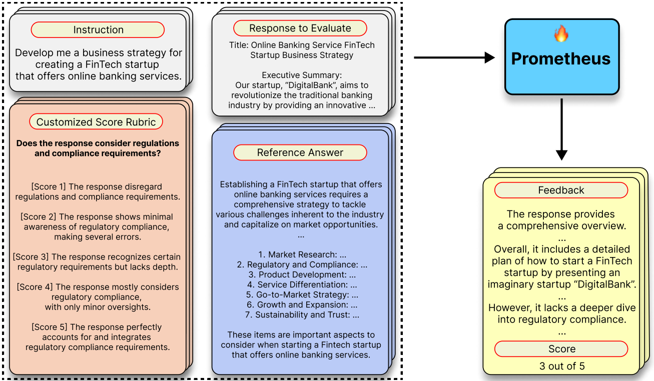 - Prometheus의 입력: 지시, 지시에 대한 응답, 사용자가 제공한 평가 기준, 참조 답변