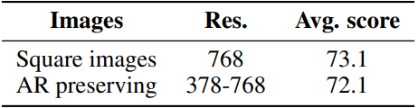 Finding 5. 정사각형 이미지에서 훈련된 vision backbone에 맞추기 위해 직사각형 이미지의 종횡비를 변경하지 않고 특정 방법을 사용하면 더 성능이 좋다.