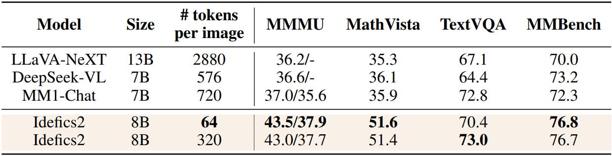 VLM의 구성에 대한 광범위한 실험을 수행하고 결과를 기반으로 foundational VLM인 Idefics2 개발
