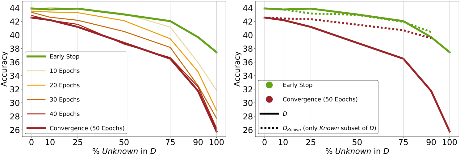 (b) Unknown을 제거한 D(점선)에서 훈련한 경우 조기 중지 모델과 수렴 모델이 거의 차이가 없는 것으로 보아 unknown data가 성능 저하를 유발하는 것으로 볼 수 있다. 또한 조기 중지한 경우 unknown data의 영향이 거의 없다.