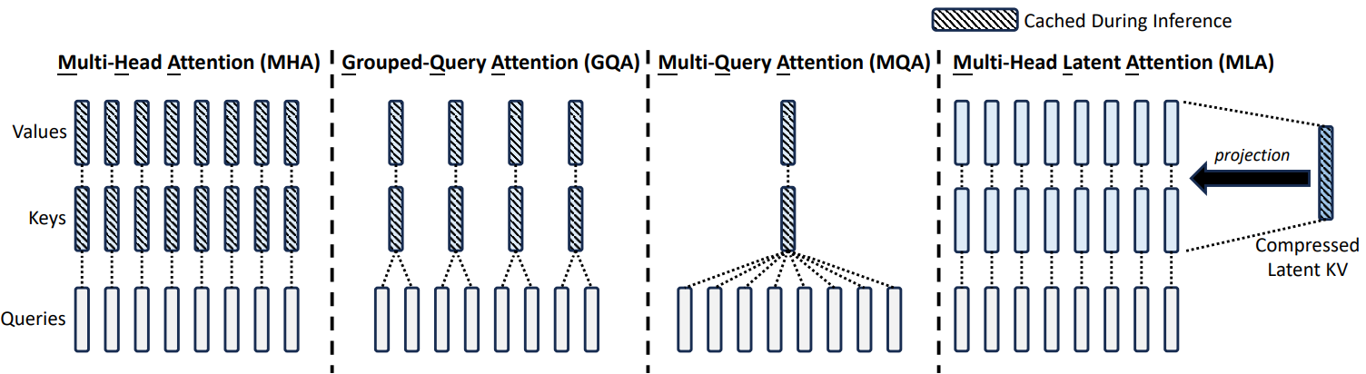 MLA는 MHA보다 훨씬 적은 양은 KV 캐시를 저장하면서도 더 나은 성능을 제공한다. (MHA, MQA 설명)
