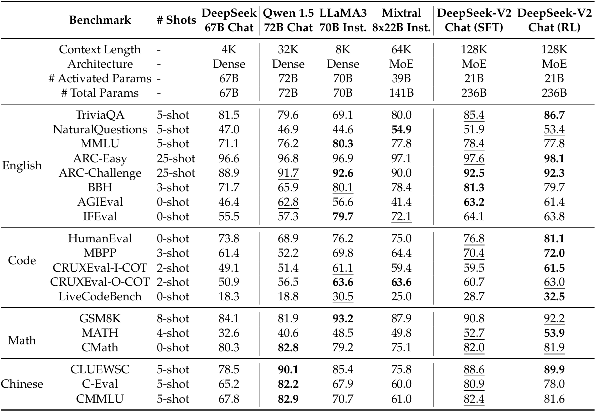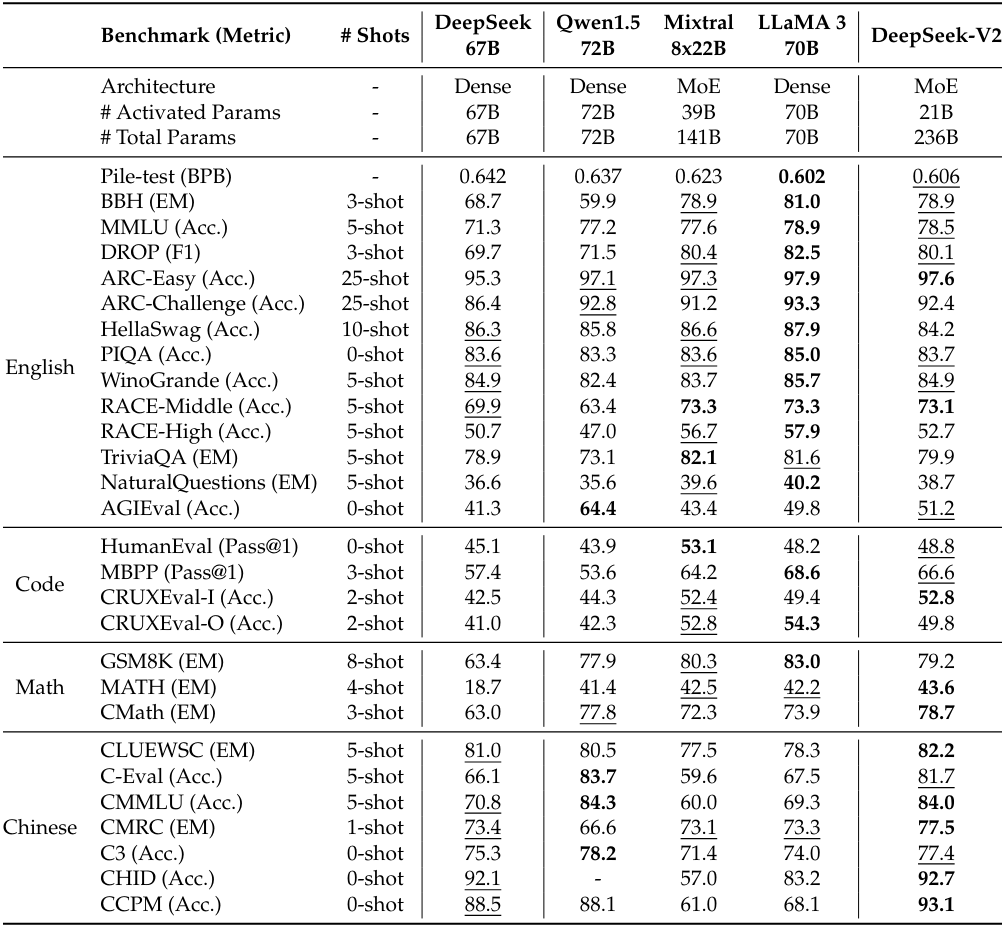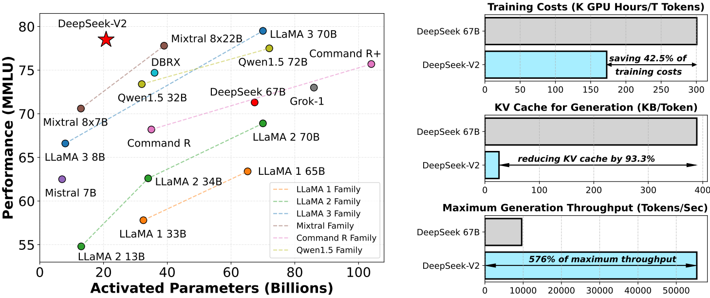 MoE를 통한 경제적인 훈련, KV 캐시 압축을 통한 효율적인 추론이 특징인 236B (활성화 피라미터 21B) MoE 모델인 DeepSeek-V2 출시 (영어, 중국어)