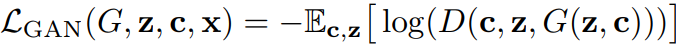 GAN loss로는 일반적인 min-max, non-saturating loss 사용하며 c 뿐만 아니라 z도 GAN에 공급한다.