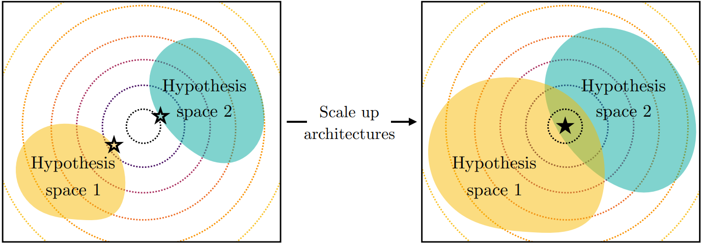 모든 학습 목표를 충족하는 global optima가 존재한다고 가정하면, 각 모델의 아키텍처와 상관없이 모델의 성능이 좋을수록 이 최적 지점으로 수렴될 것이다.