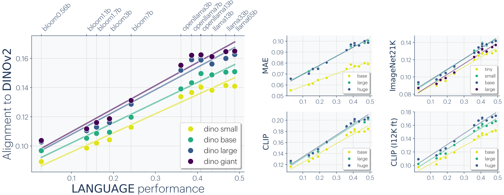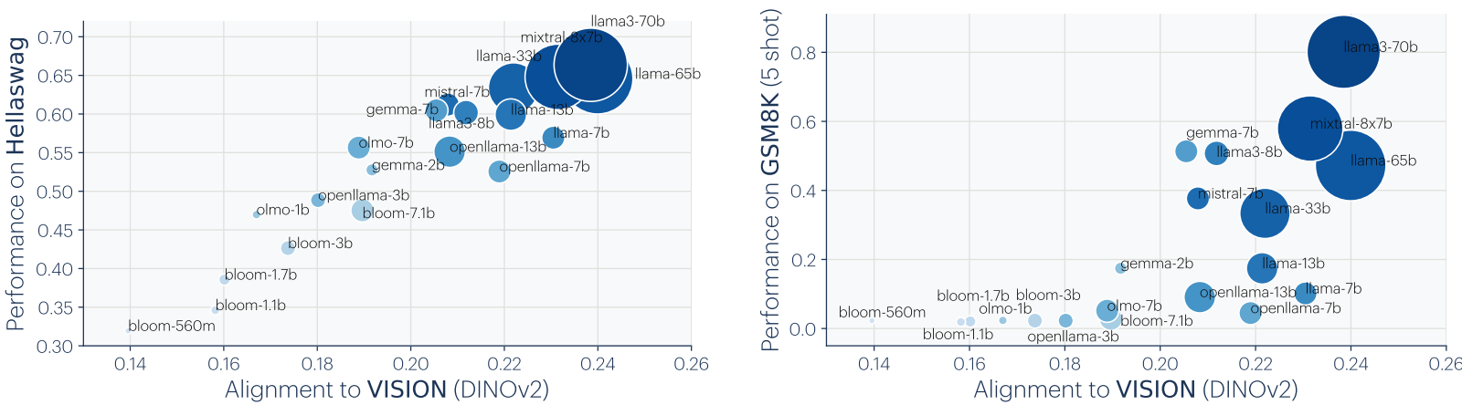 Mutual nearest-neighbor metric을 통해 독립적으로 훈련된 vision-language 모델 간의 정렬을 측정했는데, 이전 결과와 동일하게 좋은 성능의 모델일수록 더 잘 정렬되었다.