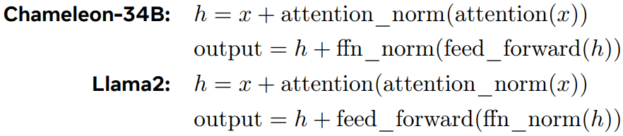 - Chameleon-34B는 dropout 대신 정규화의 순서를 바꿔 norm을 억제하는 방법을 사용했다. (dropout가 호환이 안된다고 함)