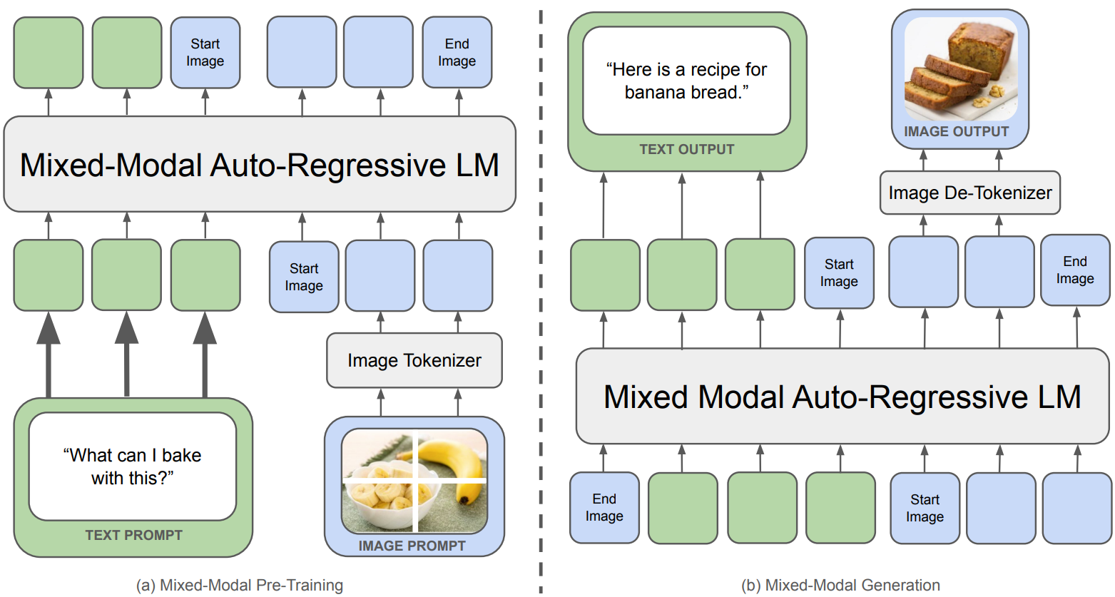 사전 훈련된 각 modal-encoder와 LLM을 사용하는 대신 end-to-end 방식으로 처음부터 훈련된 mixed-modal model인 Chameleon 소개
