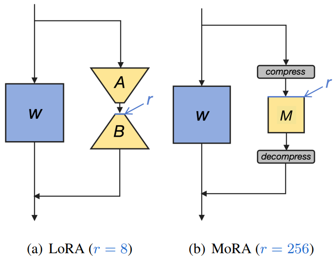 Non-parameter 연산자를 통해 LoRA와 동일한 피라미터 수를 유지하면서도 high-rank update를 달성하는 MoRA 제안
