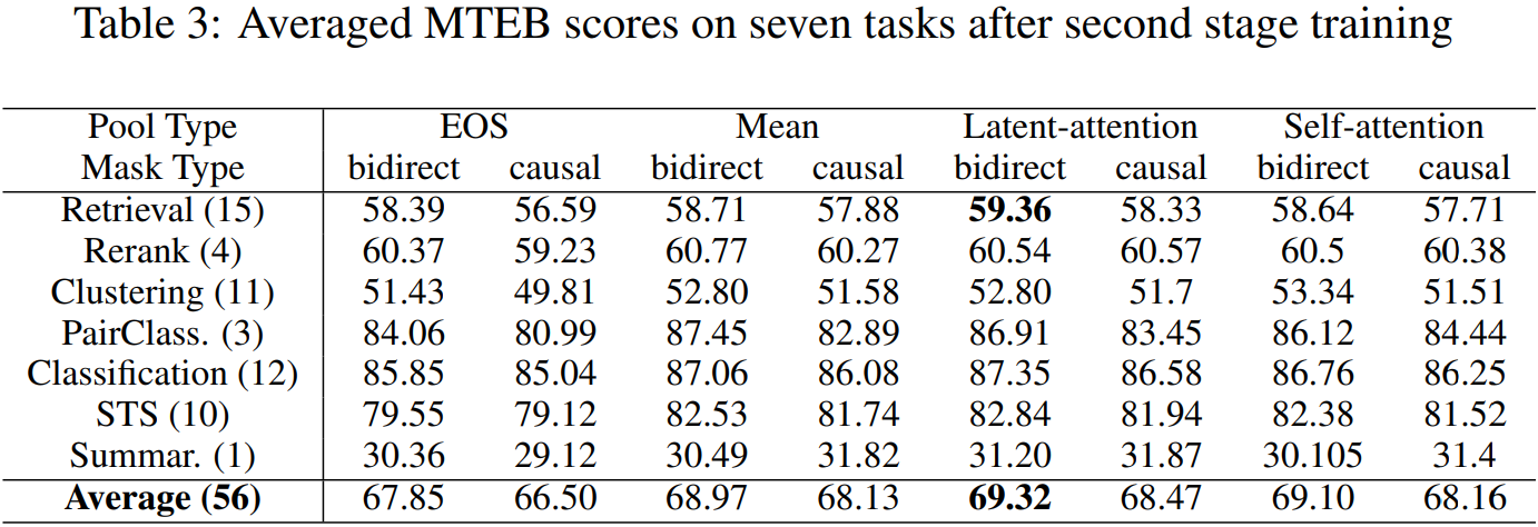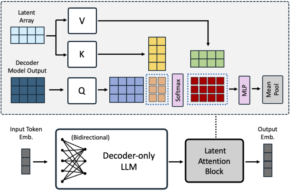 LLM의 출력을 query로 간주하고 trainable latent array와 attention을 수행한 뒤 MLP 이후 평균 풀링을 적용해 임베딩을 얻는다.