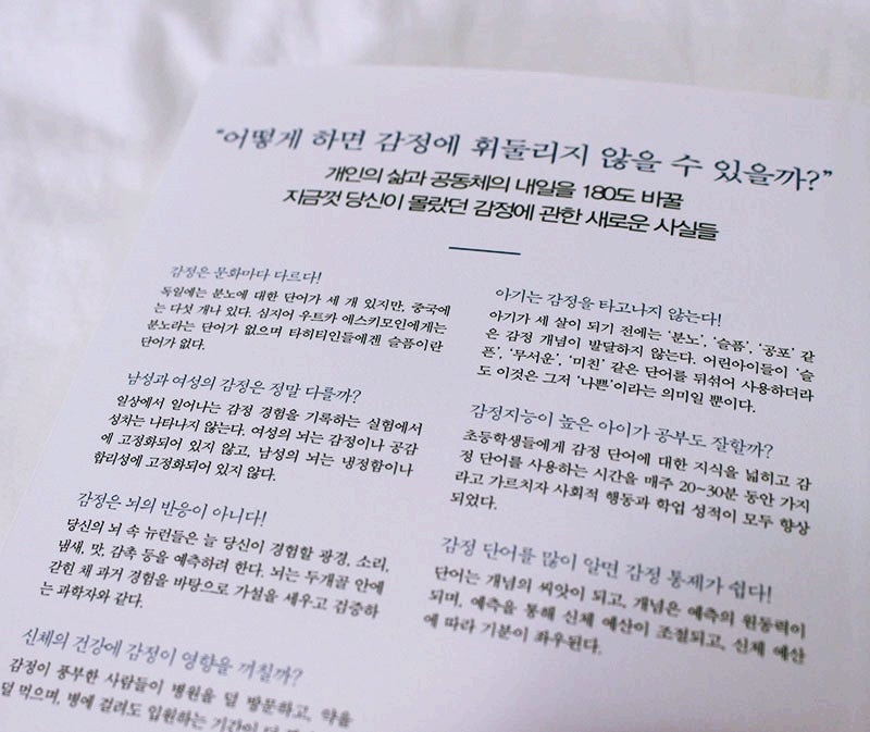 전체적인 내용은 제목대로 정직하게 우리 뇌가 어떻게 스스로 감정을 구성하는지에 대해 설명한다.
