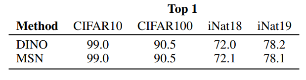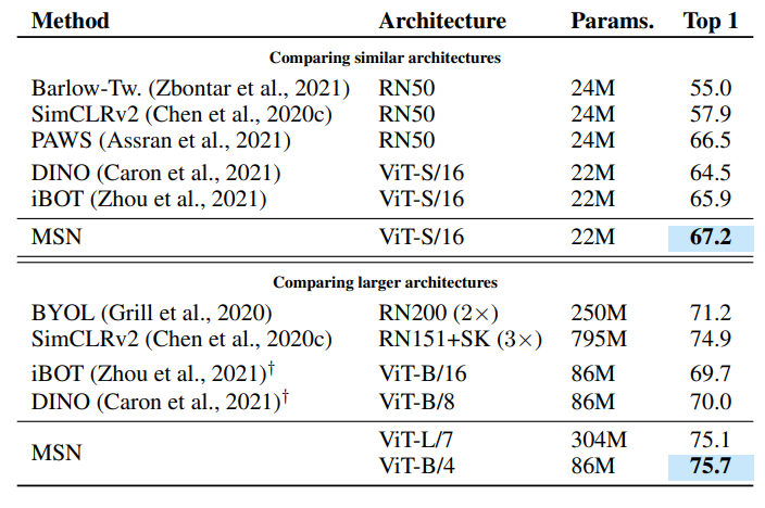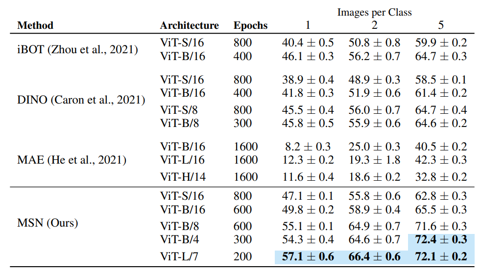 MSN은 특히 로우샷 예측에서 뛰어나다. masked auto-encoder보다 100배 적은 labels를 사용하여 우수한 분류 성능을 달성했고, 표준 1% ImageNet 로우샷 분류 작업에서 MSN에서 훈련된 ViT-B/4는 75.7%의 정확도를 달성하여 거의 10배 적은 매개 변수를 사용하면서 이전의 800M 매개 변수 최첨단 컨볼루션 네트워크를 능가한다.