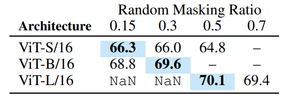 모델 크기가 클수록 마스킹 비율을 높이는 것이 효과적이다.