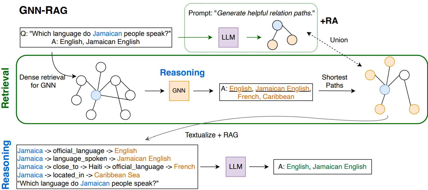 두 검색기의 장단점을 보완하기 위해 두 검색기가 검색한 추론 경로를 결합한다. GNN-RAG + RA로 표기.
