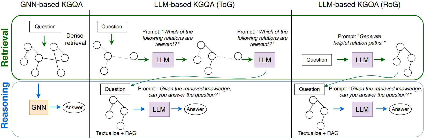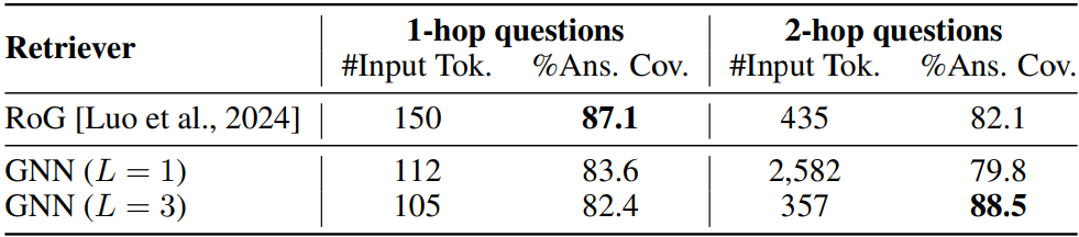 GNN 검색은 multi-hop KGQA에서 더 효과적이지만 심층 그래프 검색보다 정보 일치가 더 중요한 single-hop KGQA에서는 LLM 검색기가 더 좋다.