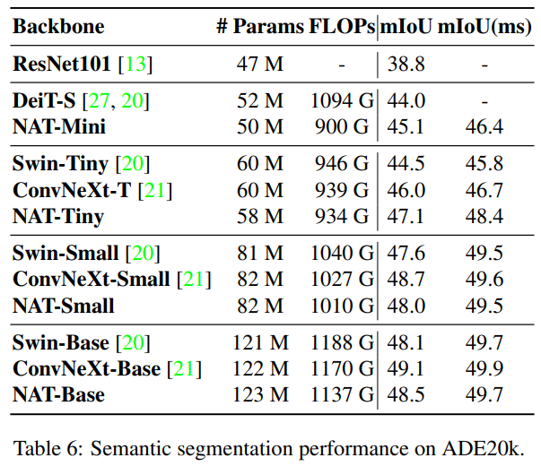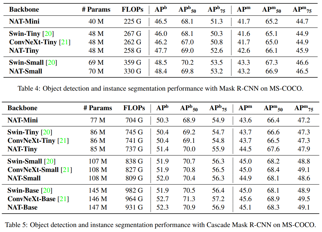 NAT에 대한 실험 결과는 경쟁력이 있다. NAT-Tiny는 4.3 GFLOP와 28M의 매개 변수만으로 ImageNet에서 83.2%의 정확도(Top-1 accuracy), MS-COCO에서 51.4% mAP, ADE20k에서 48.4% mIoU에 도달한다.