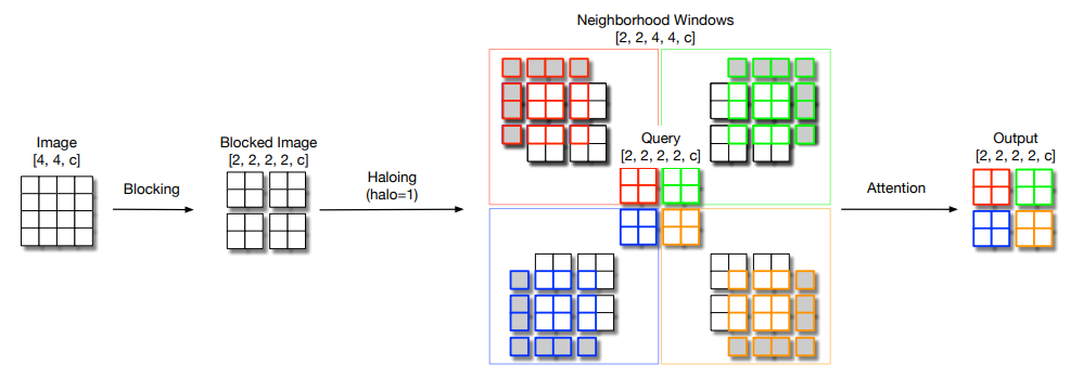 Halo Net : 다음 그림과 같은 blocked local attention을 사용했다.
