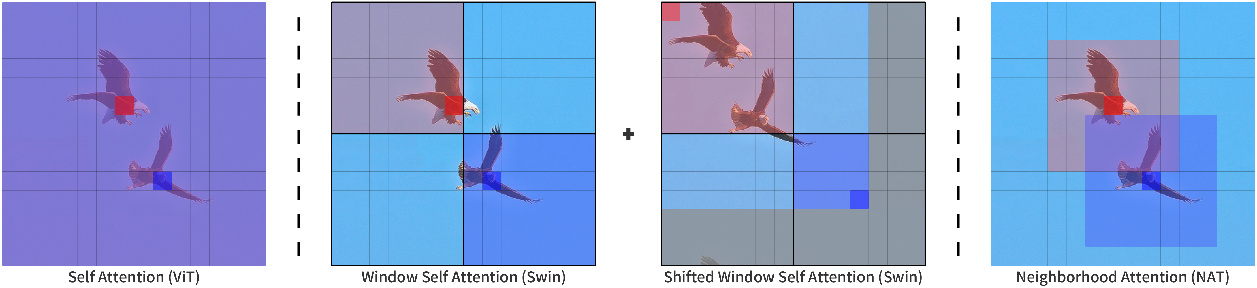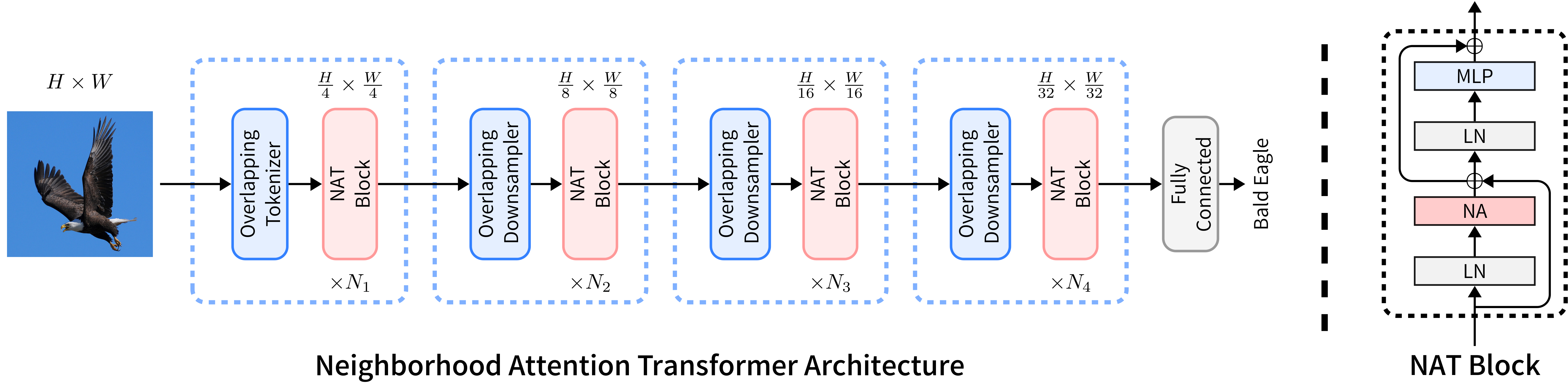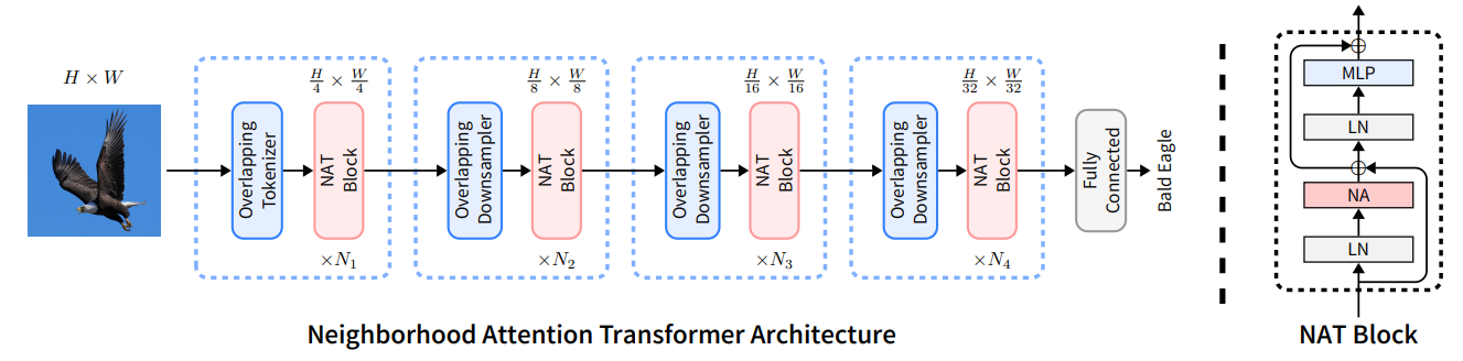본 논문에서는 NA(Neighborhood Attention)을 기반으로 한 NAT(Neighborhood Attention Transformer)를 제안한다. NA는 각 쿼리 토큰의 수신 필드를 키 값의 해당 토큰 주변의 고정 크기 이웃으로 제한한다. 이웃의 크기를 조정함으로써 변환 불변성과 등변성 사이의 균형을 유지하는 방식으로 수용 필드를 제어할 수 있게 한다. NAT의 각 계층에는 공간 크기를 절반으로 줄이는 다운 샘플링 작업이 뒤따른다. 이와 유사한 설계는 swin, focal transformer와 같은 다른 모델에서도 찾아볼 수 있지만 임베딩을 위한 컨볼루션 커널을 추가한 것이 차별점이다.