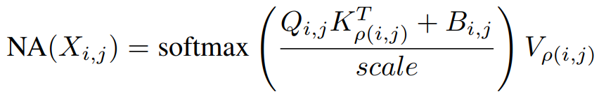 그냥 attention의 수식과 같지만 기준픽셀에 대한 위치 편향 B가 추가되었다.