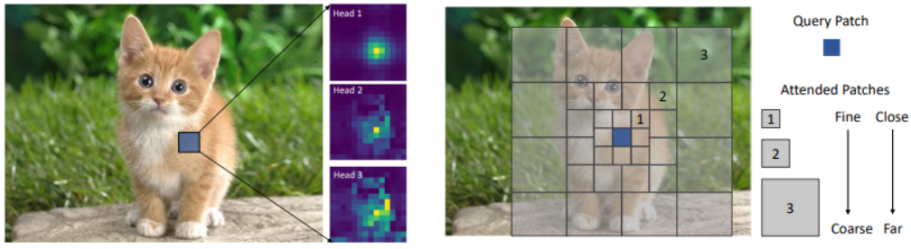 Focal Transformer : 다음 그림과 같이 가까운 토큰에는 fine attention, 먼 토큰에는 coarse attention은 적용하는 focus attention을 사용했다.