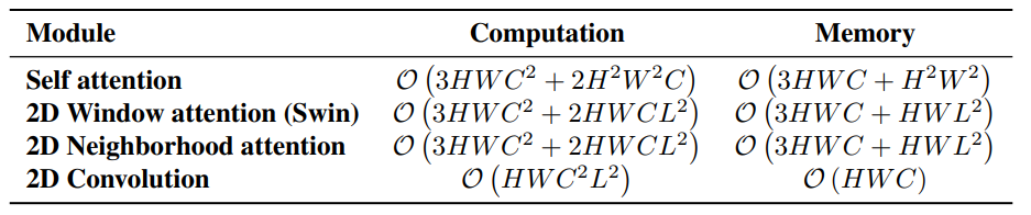 NA는 창 크기가 같을 때, swin과 같은 window-based self attention과 동일한 수의 FLOP을 가지고 있다. 이 절에서는 복잡성을 분석하고 메모리 사용에 대해 논의한다. (단순화를 위해 single-headed attention의 경우로 함)