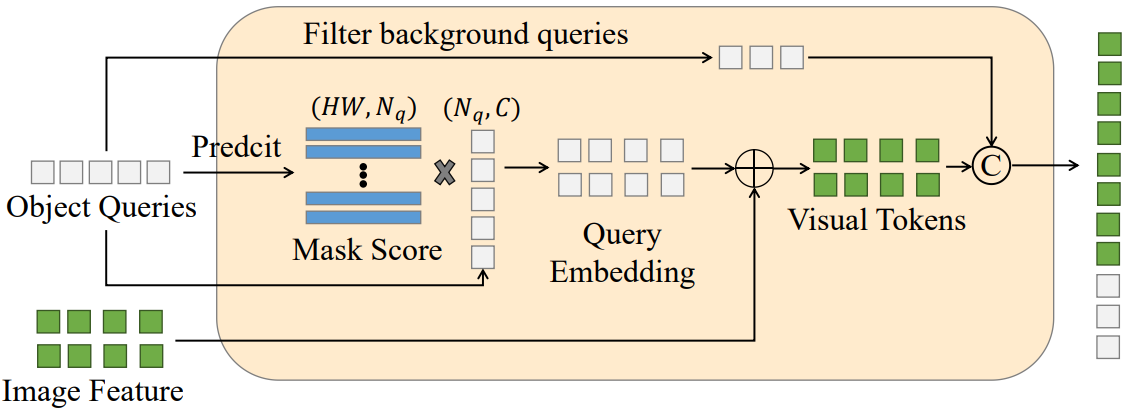 Query로부터 얻은 마스크와 신뢰도를 바탕으로 각 픽셀의 마스크 점수를 얻고 Q를 곱하여 각 픽셀에 대한 가중 객체 쿼리를 얻는다. 여기에 F를 추가하여 Tpv를 얻고