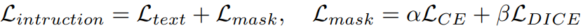 두 번째 단계에서는 LLM에 LoRA를 추가하여 같이 훈련한다. (OMG-Seg는 사전 훈련된 모델을 사용하고 훈련하지 않는다.)