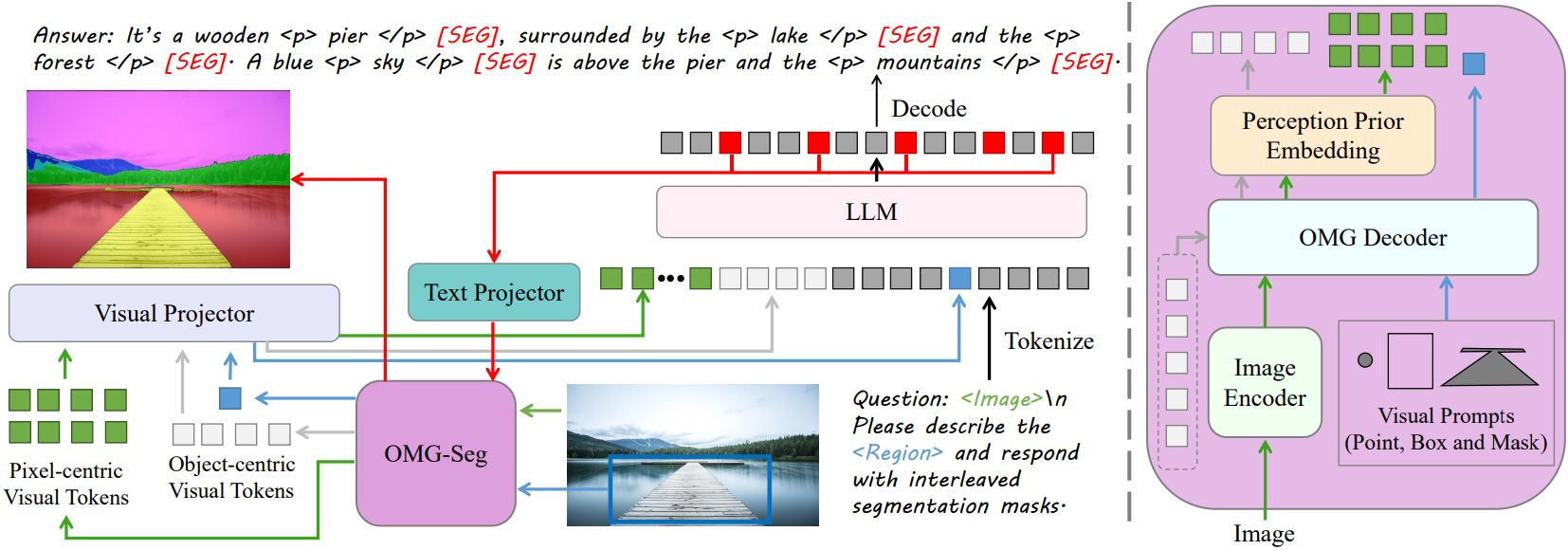사전 훈련된 OMG-Seg는 훈련 내내 고정된 상태로 유지되는데, 그러면 LLM과 잘 정렬되지 않기 때문에 object query를 image feature에 통합하는 perception prior embedding 과정을 추가한다.