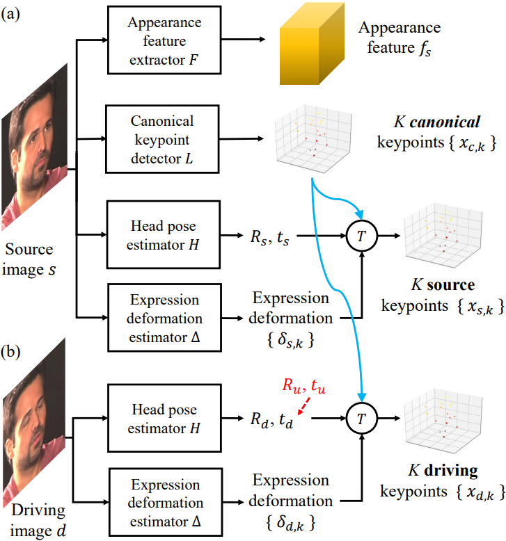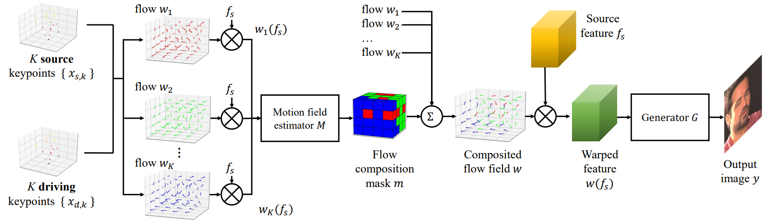 warping field estimator W, generator G로 구성되며, 추출된 정보들을 통해 각 이미지의 암시적 3D 키포인트를 생성한 다음