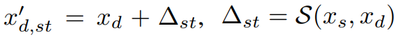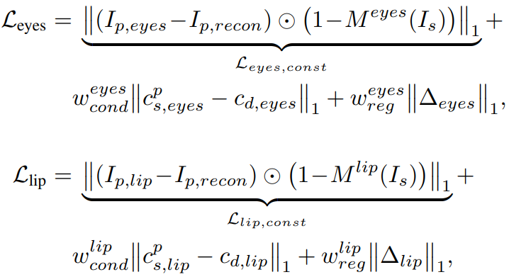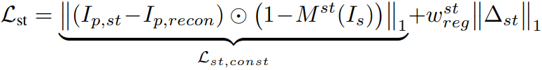 마스크 M으로 어깨 영역을 제외한 나머지 부분을 마스킹하고 예측 이미지 Ip,st = D(W(fs; xs, x'd,st))와 자기 재구성 이미지 Ip,recon = D(W(fs; xs, xs)) 간의 차이를 최소화하도록 한다. 뒷항은 정규화항.