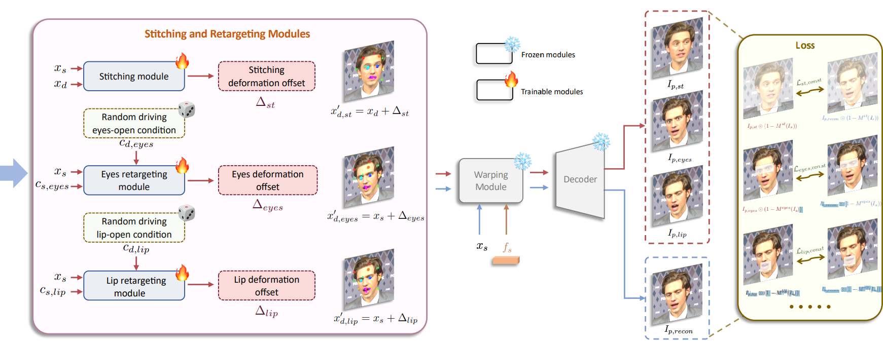 Stitching module은 몸과 얼굴이 연결되는 '어깨 영역'의 불일치를 해소하고 eyes retargeting module은 눈 크기 차이가 클 때 눈 감김 문제를 해결한다. Lip retargeting module도 비슷한 역할을 한다.
