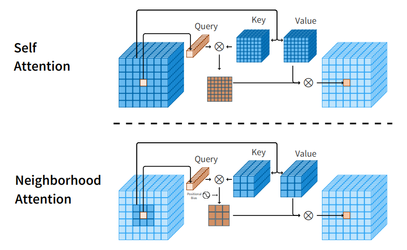 본 논문에서는 NA(Neighborhood Attention)을 기반으로 한 NAT(Neighborhood Attention Transformer)를 제안한다. NA는 각 쿼리 토큰의 수신 필드를 키 값의 해당 토큰 주변의 고정 크기 이웃으로 제한한다. 이웃의 크기를 조정함으로써 변환 불변성과 등변성 사이의 균형을 유지하는 방식으로 수용 필드를 제어할 수 있게 한다. NAT의 각 계층에는 공간 크기를 절반으로 줄이는 다운 샘플링 작업이 뒤따른다. 이와 유사한 설계는 swin, focal transformer와 같은 다른 모델에서도 찾아볼 수 있지만 임베딩을 위한 컨볼루션 커널을 추가한 것이 차별점이다.