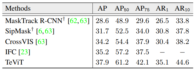 3. TeViT는 거의 convolution-free이며 SoTA VIS 결과를 얻는다. 초기 시간적 feature 융합과 쿼리로서의 비디오 인스턴스의 개념은 인스턴스 수준 인식 작업을 위한 효과적인 비디오 transformer를 구축하는 방법을 조명한다.