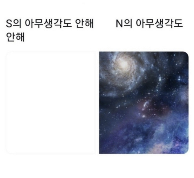 "아무 생각도 하지 마"라고 했을 때, S는 정말로 아무 생각 안 하고 N은 "어떻게 아무 생각을 안 할 수가 있지?"라는 생각을 한다.