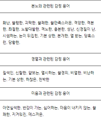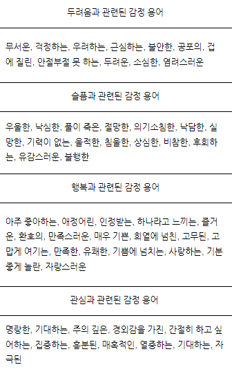 감정은 어떻게 만들어지는가? 라는 책에는 이런 말이 있다. "감정 단어를 많이 알고 있을수록 미묘한 감정을 더 잘 구별할 수 있고, 감정을 더 잘 구별할수록 더 잘 통제할 수 있다." 그러고는 감정에 휘둘리지 않는 방법으로 더 많은 감정을 알고 경험해 볼 것을 제안한다.
