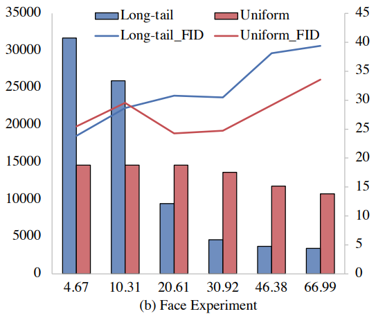 얼굴 방향에 대한 Long-tailed 실험의 경우 얼굴 각이 큰 세트일수록 FID가 증가한다. 균등 실험에서도 마찬가지지만, 상승 추세가 점진적이다. (그림의 해석에 대해서 자세히 나와있지가 않은데, 막대 그래프는 수집한 데이터셋에서 해당 특성을 가진 이미지의 수, 실선 그래프의 경우 각각의 세트로 훈련된 모델의 생성된 이미지에서 해당 특성을 가진 이미지들의 FID를 말하는 것 같다.)