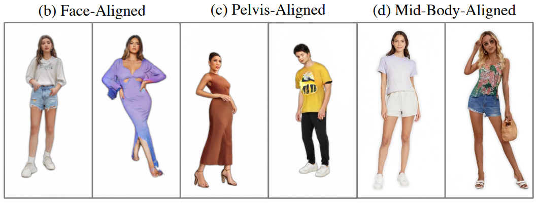 SHHQ에서 50K 이미지를 무작위로 샘플링하고 다음과 같이 얼굴, 골반, 몸의 중간지점을 중심으로 정렬한다. 중간지점 정렬의 경우, 신체비율이 사람마다 다르므로 segmentation mask를 사용하여 몸의 평균좌표를 찾는다.
