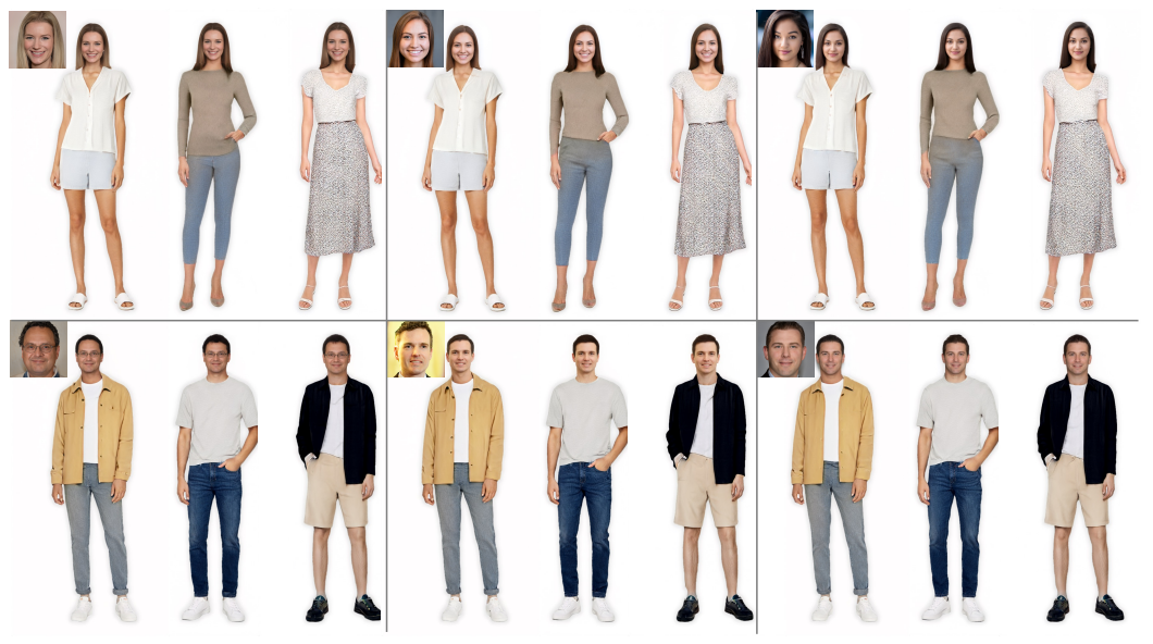 본 연구에서는 FFHQ에서 생성된 얼굴과 SHHQ에서 생성된 몸 각각에 대한 잠재코드를 반복적으로 최적화하여 InsetGAN의 프로세스를 다시 구현한다. 아래는 각각의 얼굴과 몸을 혼합한 예제이다.