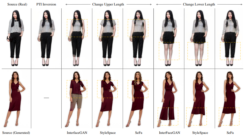 또한 얼굴 모델을 기반으로 한 이전 편집 방법을 인체 모델에 적용하여 인간 편집 벤치마크를 구성한다(이미지 반전을 위한 PTI, InterFaceGAN, StyleSpace, 이미지 조작을 위한 SeFa). 최근에 나온 모델인 InsetGAN 또한 본 연구의 기준 모델로 평가되어 사전 훈련된 인간 생성 모델의 잠재적 사용을 추가로 보여준다.