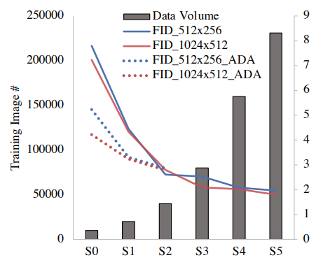 크기에 따라 6개의 하위 데이터셋을 구성하고 각각을 S0(10K), S1(20K), S2(40K), S3(80K), S4(160K), S5(230K)로 표기. S0는 Filtered-DeepFashion 이다. 각 세트에 대한 두 가지 해상도(1024x512, 512x256)에 대해 교육하며 S0, S1, S2는 ADA를 사용한 추가 훈련도 진행한다. 평가 지표로는 FID(Frechet' Inception Distance)와 IS(Inception Score) 사용.