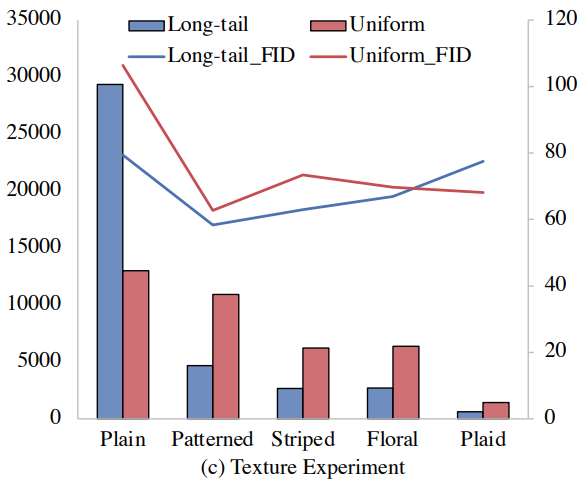 의복 texture에서는 둘 다 plain을 제외하고 데이터의 양이 감소함에 따라 FID 꾸준히 증가하며, 유의미한 차이는 나지 않는 것 같다. Long-tail의 plain의 FID가 낮고 plaid가 높은 것은 그냥 절대적인 데이터 수의 많고 적음에 따른 것이라고 추론한다.(근데 그렇게 치면 얼굴 방향에서의 차이도 그냥 균등 세트에서 얼굴 각이 큰 이미지가 많기 때문 아닌가?)