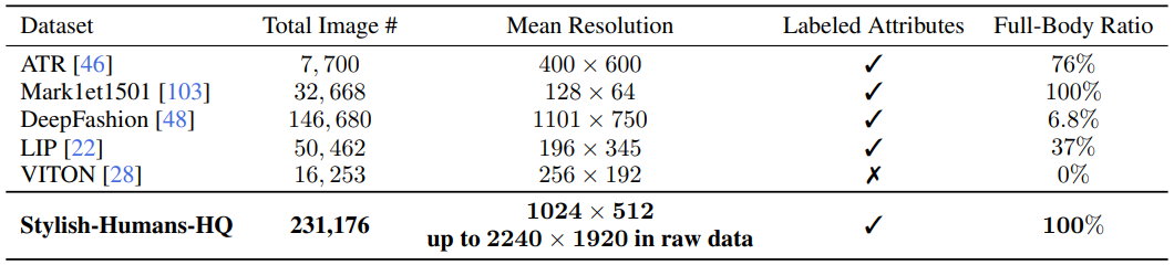 SHHQ 데이터셋과 다른 데이터셋들을 비교한 표. 갯수도 압도적으로 많고 해상도도 제일 높으며 라벨이 있고, 모든 이미지에서 전신이 포함되어 있다.