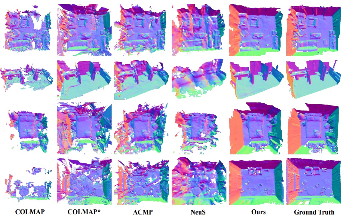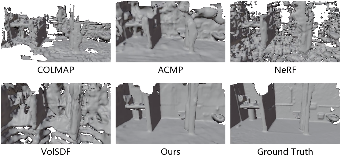 3D 장면 재구성에서 입력 이미지가 주어지면, 전통적인 방법은 일반적으로 multi-view stereo (MVS) 알고리즘을 기반으로 각 이미지에 대한 깊이 맵을 추정한 다음 추정된 깊이 맵을 3D 모델로 융합한다. 이러한 방법은 대부분의 경우 성공적인 재구성을 달성하지만, 신뢰할 수 없는 스테레오 매칭으로 인해 실내 장면의 바닥 및 벽과 같은 질감이 낮은 영역을 처리하는 데 어려움이 있다.