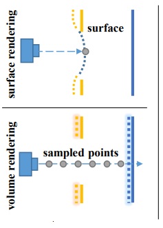 볼륨 렌더링은 하나의 카메라 광선(=ray)에서 여러 개의 점을 샘플링함으로써 갑작스러운 깊이 변화에도 유연하게 처리할 수 있다.
