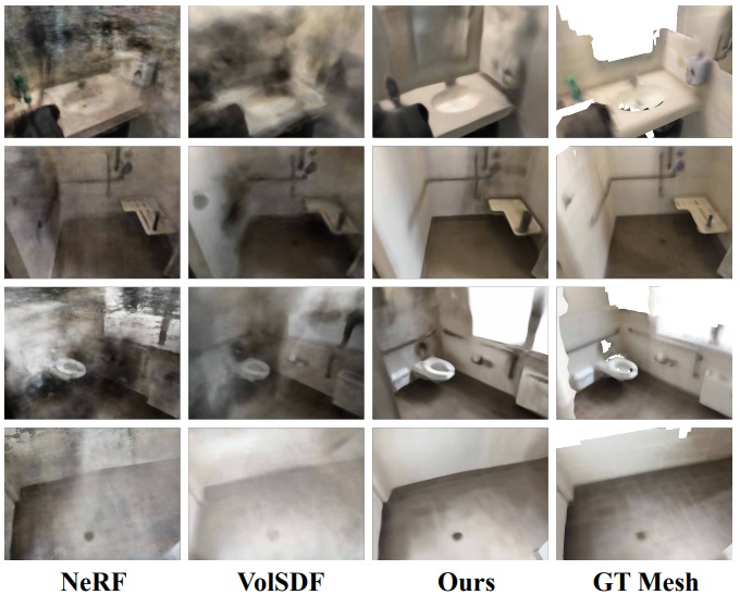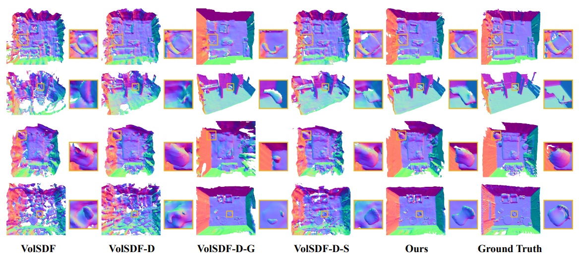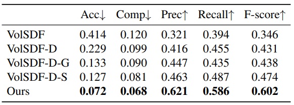 4가지 구성으로 훈련한다. 기본 VolSDF, Ld를 추가한 VolSDF-D, Lgeo를 추가한 VolSDF-D-G, VolSDF-D에서 추가적으로 3D 공간의 semantic을 학습한 VolSDF-D-S.